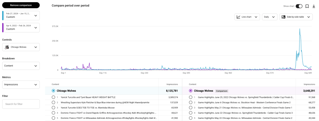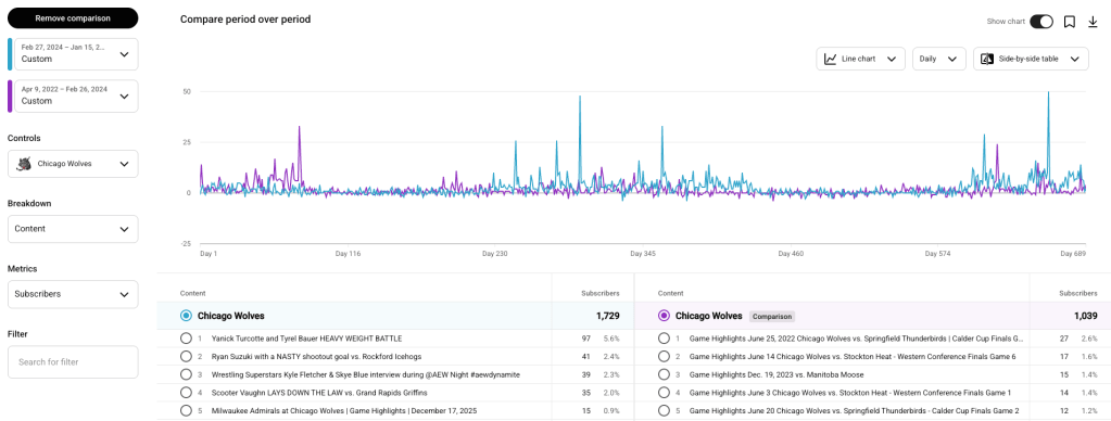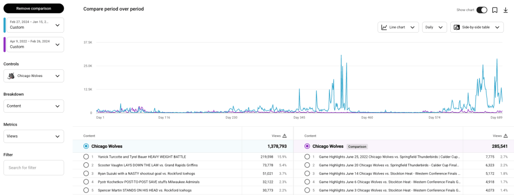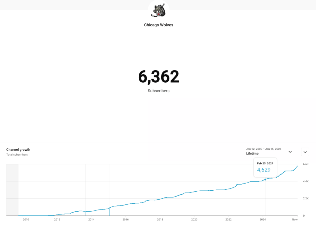 In February of 2024 I assumed management duties of the Chicago Wolves YouTube Channel. The channel had been active for 15 years at the time and had just over 4,500 subscribers. When I took over, I saw an opportunity to connect with fans that was not being utilized to fullest extent. By taking advantage of Youtube shorts, posts, and uploading a greater variety of video content more often the channels subscribers grew 37% in just two years. Additionally, when compared period over period channel impressions more than doubled and views and likes quadrupled. While these duties were not originally part of the job description when I began with the Wolves, I am very proud of the growth that I have been able to achieve since taking over.